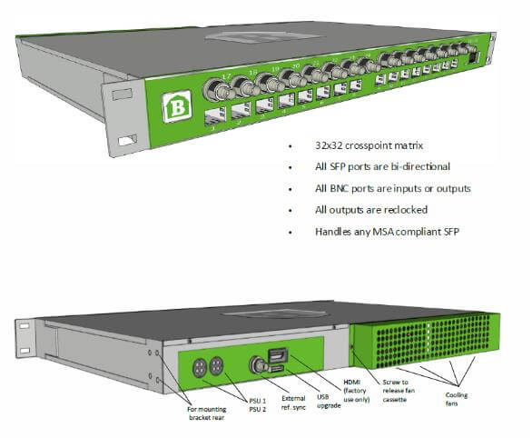 The BarnOne 41 Frame provide 16 SFP+ Ports/12G Capable. The BarnOne series of routers can provide a 32 x 32 built-in routing system with a combination of BNC and SFP I/O ports to satisfy any application.
